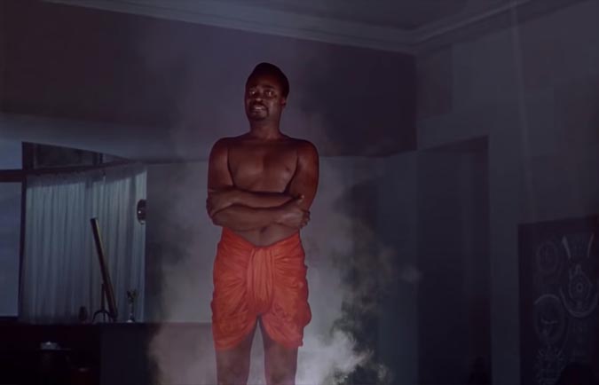 Smoke rises from the floor and the apparition of a demon transpires – in the form of a bare-chested black man in red harem-type shorts and yellow eyes.