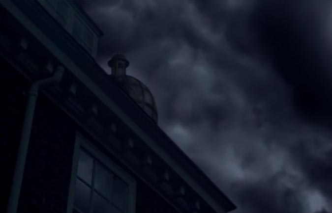 The opening title sequence begins with its dramatic and ominous music; the stars of the starry night sky are tainted in a red hue and they fade out as smoke billows over the screen.