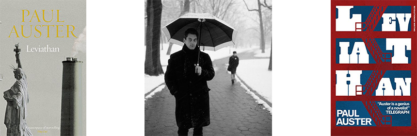 Various covers of the novel and Paul Auster (middle) in what looks like Central Park.